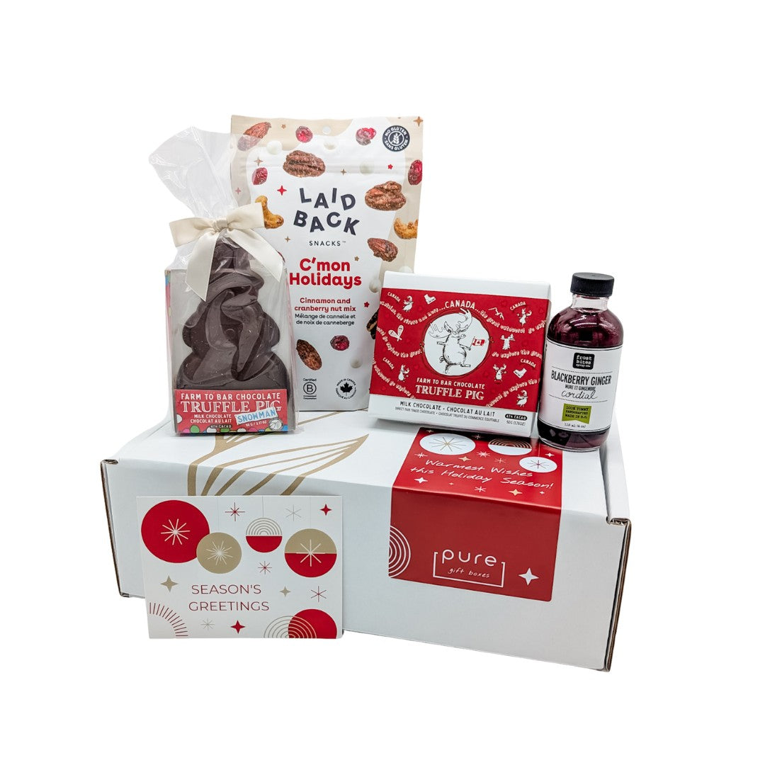 - Eco-friendlier gift box with holiday label, kraft crinkle fill, Holiday theme notecard & your personal message.